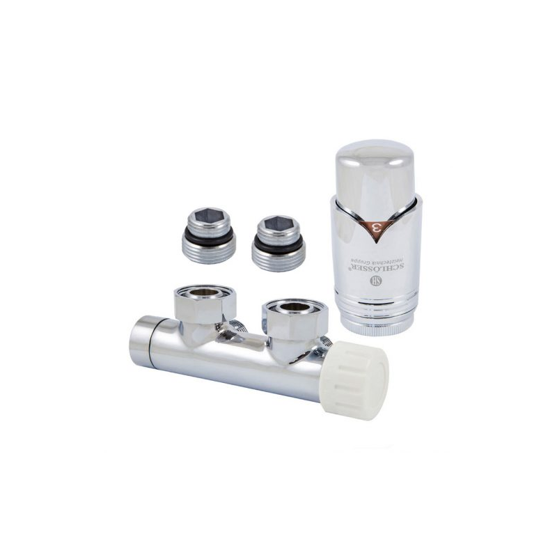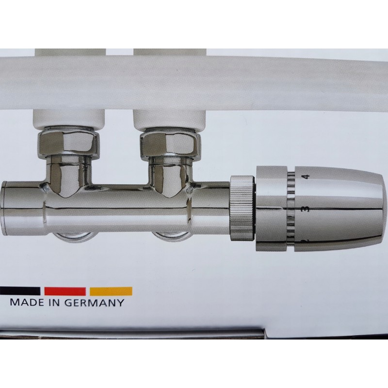 Kompletny zestaw zaworów AG1 (kolor CHROM) niemieckiej firmy Schlosser dedykowany do grzejników firmy EXCELLENT.
