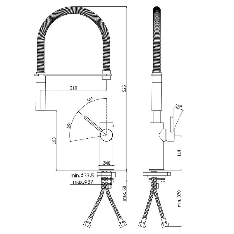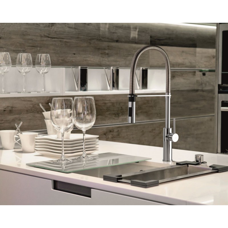 Bateria kuchenna, będąca jednym z profesjonalnych kranów. Cechuje ją atrakcyjny kształt oraz wysoka wydajność techniczna. Wyposażona w dwu-strumieniową główkę prysznicową oraz elastyczny wąż, który gwarantuje wysoki komfort obsługi.