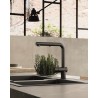 Bateria kuchenna, którą cechuje wyjątkowy design, a jej zaletą jest praktyczność. Korpus dźwigni jest ustawiony poprzecznie, a metalowy prysznic Dualget uzupełnia go z punktu widzenia funkcjonalności.