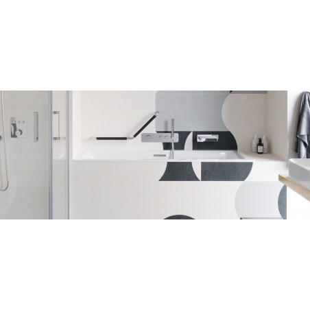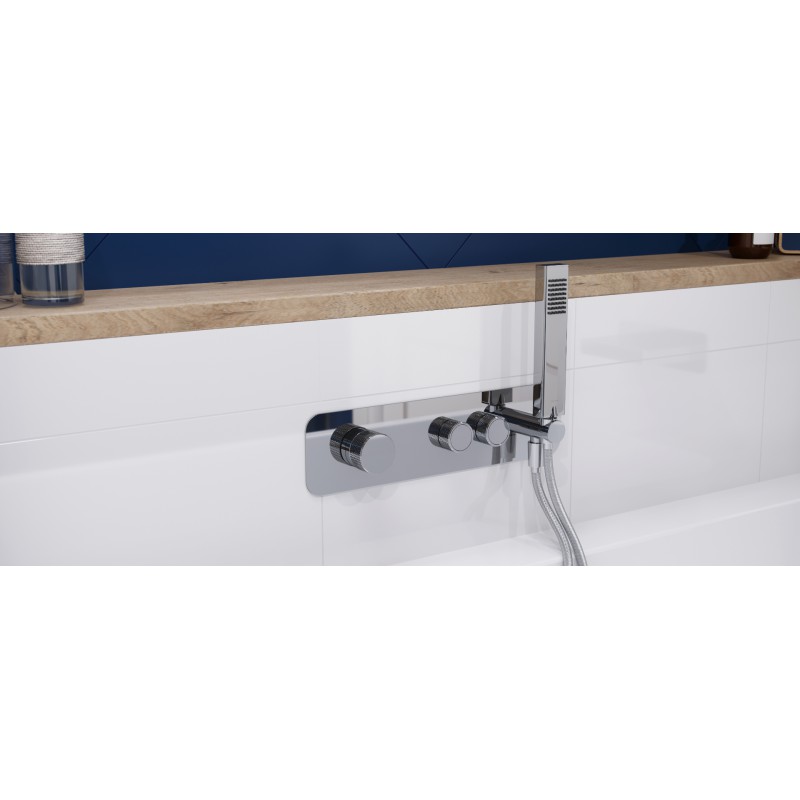 Bateria prysznicowo-wannowa 2-funkcyjna podtynkowa serii Krotos posiada Fix-Box, który ułatwia instalację baterii oraz zapewnia stały dostęp rewizyjny do mechanizmu baterii. Mechaniczny przełącznik funkcji pozwala na wygodny wybór wypływu wody – system Easy-Click pozwala na regulację jednocześnie źródła wody (włącz-wyłącz) oraz ciśnienia przez obrót tego samego pokrętła. Temperaturę można regulować dzięki pokrętle po lewej. Bateria posiada wbudowany uchwyt słuchawki prysznicowej z przyłączem kątowym dla węża prysznicowego.