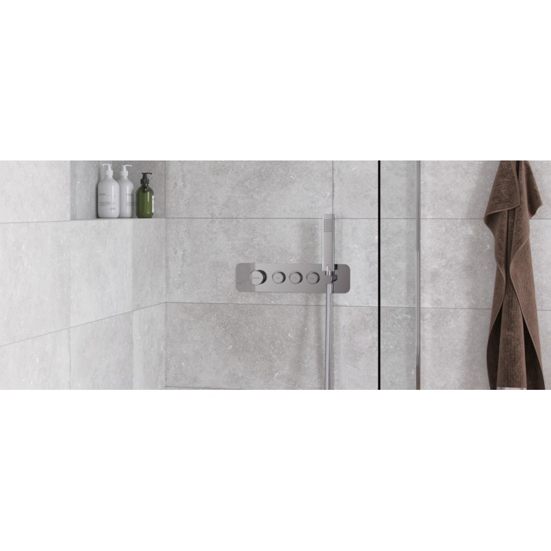 Bateria prysznicowo-wannowa 3-funkcyjna podtynkowa serii Krotos posiada Fix-Box, który ułatwia instalację baterii oraz zapewnia stały dostęp rewizyjny do mechanizmu baterii. Mechaniczny przełącznik funkcji pozwala na wygodny wybór wypływu wody – system Easy-Click pozwala na regulację jednocześnie źródła wody (włącz-wyłącz) oraz ciśnienia przez obrót tego samego pokrętła. Temperaturę można regulować dzięki pokrętle po lewej. Bateria posiada wbudowany uchwyt słuchawki prysznicowej z przyłączem kątowym dla węża prysznicowego.