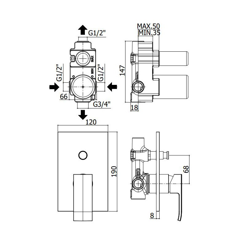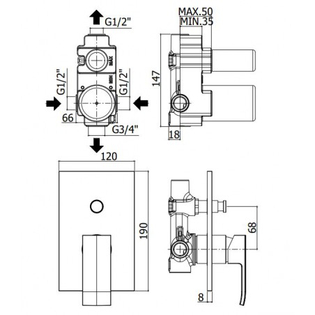 - przyłącza: 1/2”G ciepło/zimno oraz górne, 3/4”G przyłącze dolne