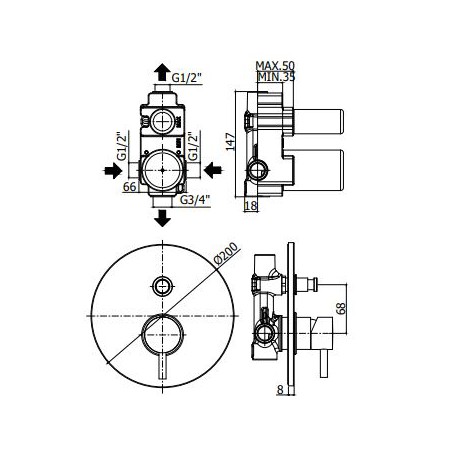 - przyłącza: 1/2”G ciepło/zimno oraz górne, 3/4”G przyłącze dolne