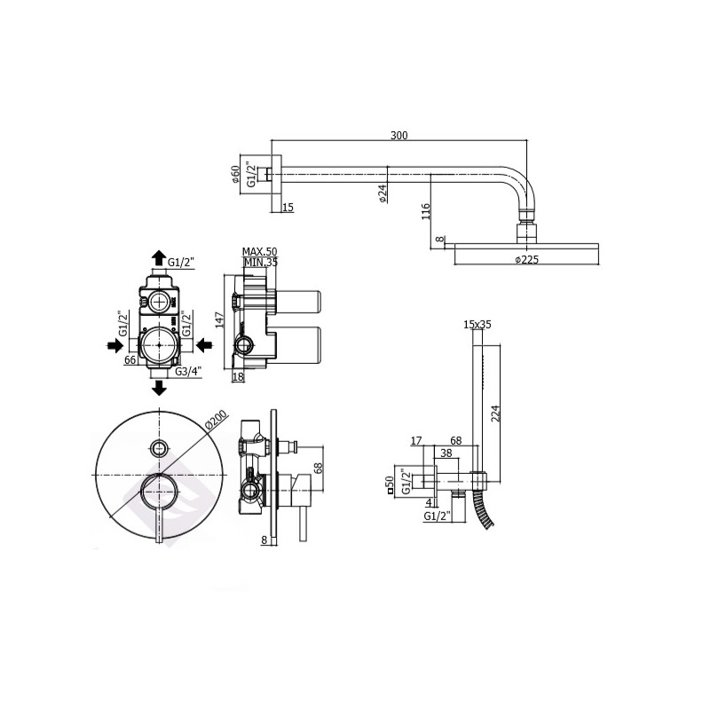 - przyłącze ciepłej i zimnej wody 1/2", dolne wyjście 3/4", górne wyjście 1/2"