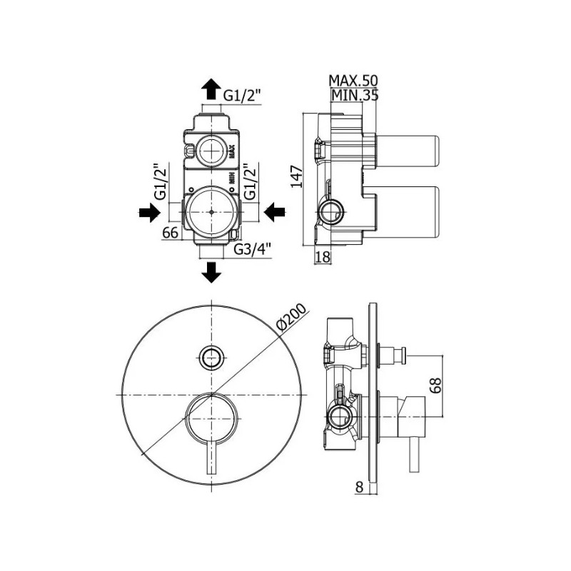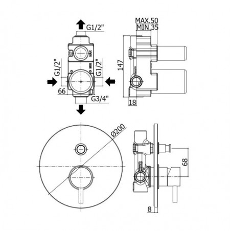 - przyłącze ciepłej i zimnej wody 1/2", dolne wyjście 3/4", górne wyjście 1/2"