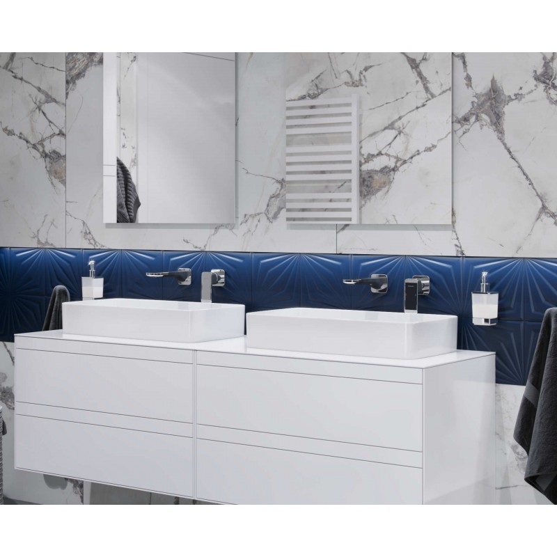Bateria umywalkowa podtynkowa posiada wylewkę o zasięgu 196mm, może być instalowana na wymaganej wysokości nad umywalką. Dzięki temu z powodzeniem może być stosowana do umywalek nablatowych bez otworu na baterię. Posiada wbudowane: głowicę Kerox oraz perlator Neoperl Slim. Posiada rozdzielne delikatne rozety o wymiarach 60×60. Jej idealnym uzupełnieniem będą korki umywalkowo-bidetowe w kolorze czarnym lub białym (dopasowanym do koloru ceramiki). Dostępna także w kolorze chrom.