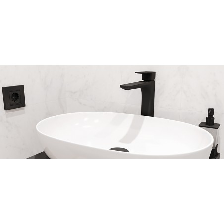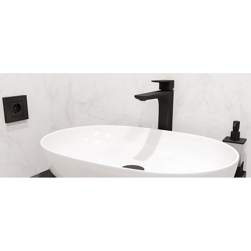 Bateria umywalkowa wysoka posiada wylewkę o zasięgu 189mm i wysokości 246mm. Dzięki temu z powodzeniem może być stosowana do umywalek nablatowych bez otworu na baterię. Korpus umywalki wykonany jest z jednego odlewu. Posiada wbudowane: głowicę Kerox oraz perlator Neoperl Slim. Jej idealnym uzupełnieniem będą korki umywalkowo-bidetowe w kolorze czarnym lub białym (dopasowanym do koloru ceramiki). Dostępna także w kolorze chrom.