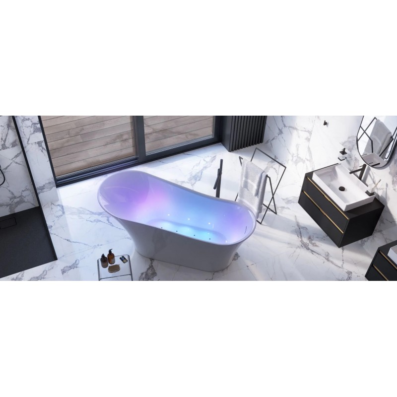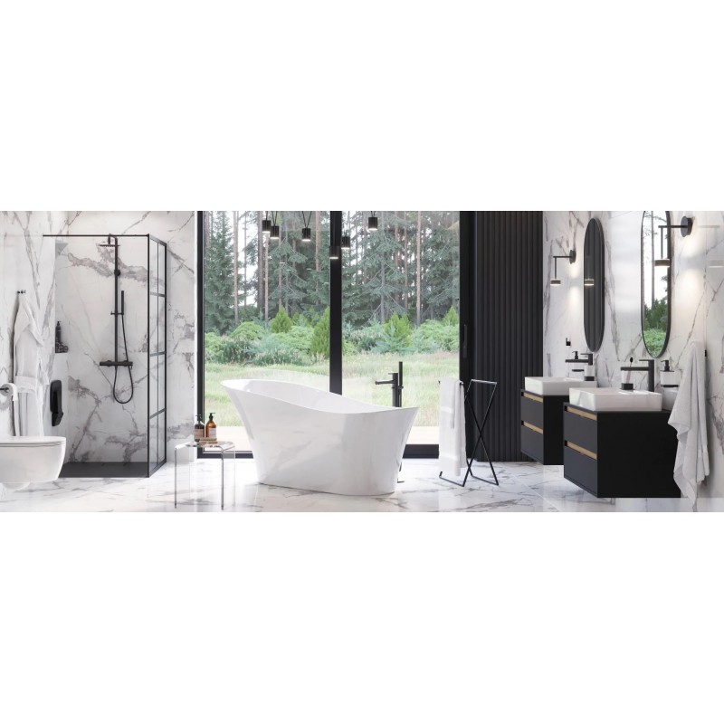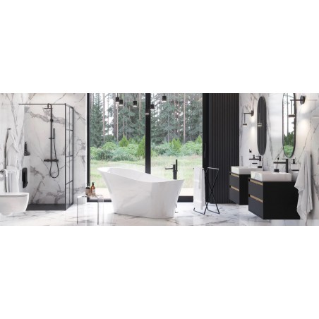 Bateria wannowa wolnostojąca wykonana jest z chromowanego mosiądzu, posiada wylewkę o wysięgu 259 mm i może być stosowana do większości wanien wolnostojących. Wymaga montażu podłogowego przy zastosowaniu Fix-box'a, który dołączamy do baterii w cenie. Posiada wbudowaną głowicę Hydroplast, mechaniczny przełącznik funkcji słuchawka/wylewka. Dostępna w 4 kolorach: biały, czarny, chrom i złoto.