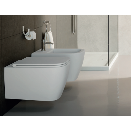 Ceramika Esedra to kolekcja bardzo oryginalnych wzorów ceramiki sanitarnej, zaprojektowana przez sławnych włoskich projektantów. Linia Quadra to wybór dla tych, którzy cenią klasyczny wzór i opływowe kształty w nowoczesnym designie. Wykonanie z najwyżej jakości włoskiej ceramiki czynią z niej doskonały produkt dla wymagających. Miska wisząca bezrantowa WC Quadra NO-RIM w kolorze biały POŁYSK posiada ukryte mocowania, w komplecie z deską WC SLIM wolnoopadającą z Duroplastu z metalowymi zawiasami.