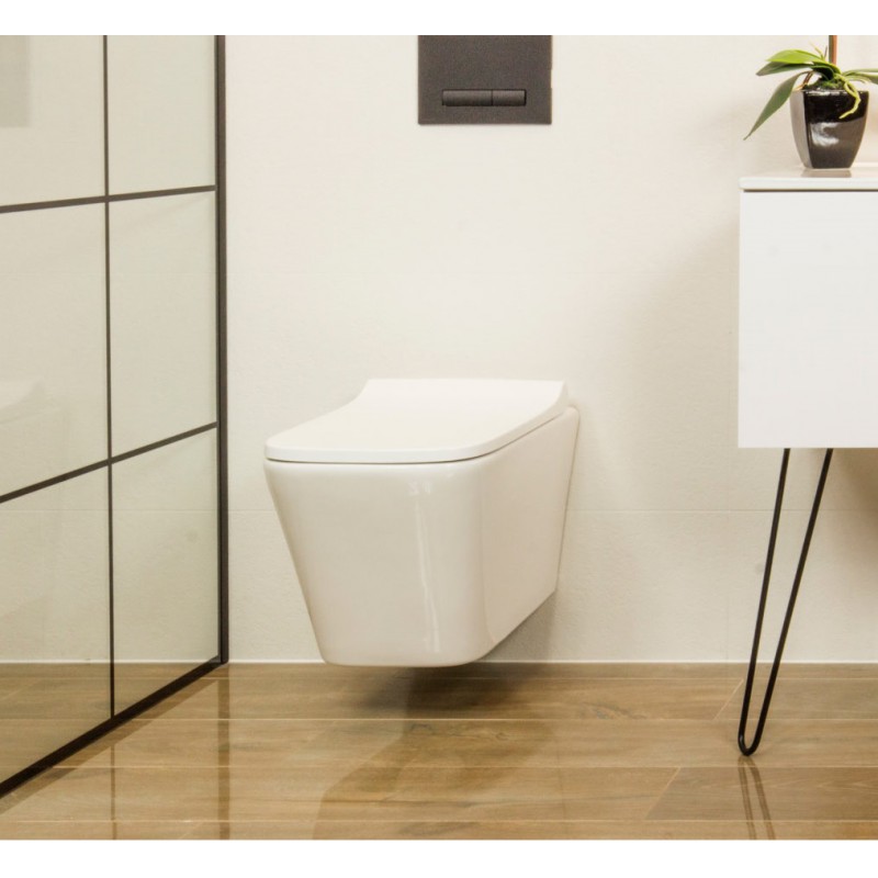 Kompletna muszla WC z deską wolnoopadającą, którą możemy wypiąć jednym ruchem ręki (umożliwi to łatwe czyszczenie trudno dostępnych miejsc pod deską jak i samej deski).
