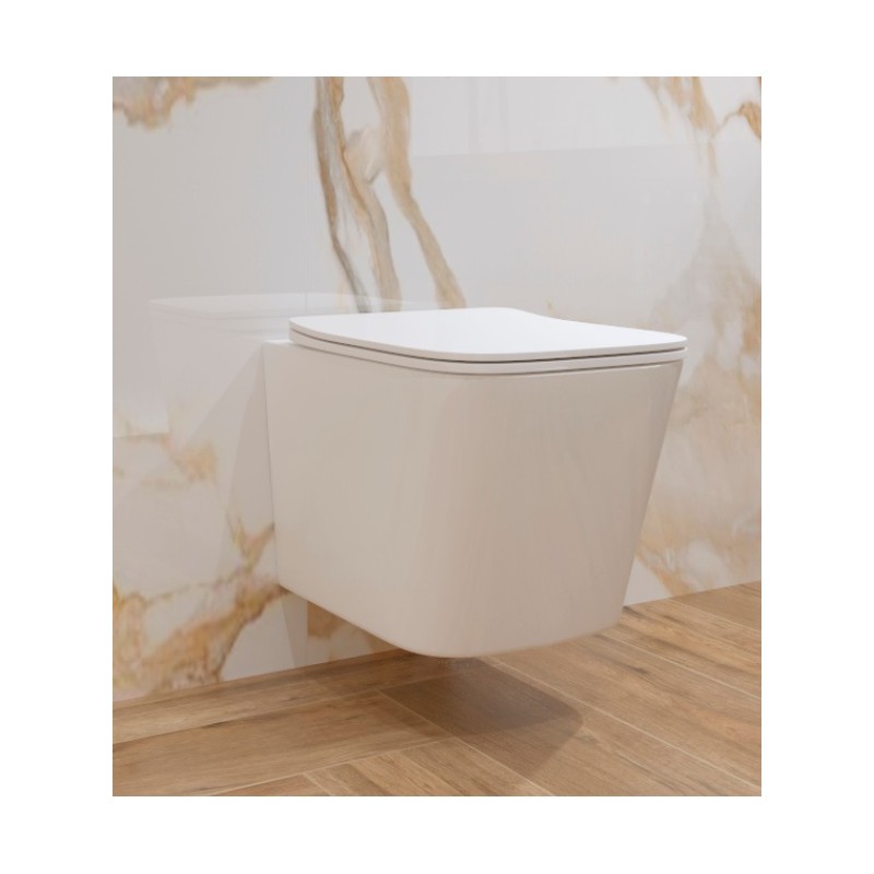 Kompletna muszla WC z deską wolnoopadającą, którą możemy wypiąć jednym ruchem ręki (umożliwi to łatwe czyszczenie trudno dostępnych miejsc pod deską jak i samej deski).