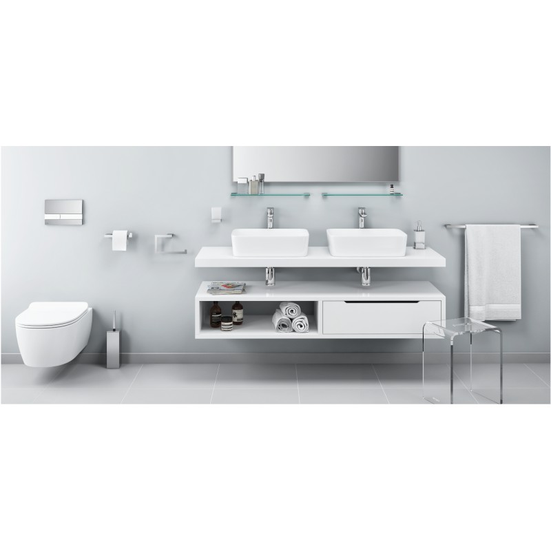 Seria Riko to bogata oferta dodatków łazienkowych o klasycznych, stonowanych kształtach będących idealnym wyborem do nowoczesnej łazienki. Dozownik do mydła w płynie RIKO składa się z metalowego uchwytu wykonanego z wysokiej jakości mosiądzu pokrytego chromem oraz pojemnika wykonanego ze szkła mrożonego wyposażonego w pompkę umożliwiającą dozowanie mydła w płynie.