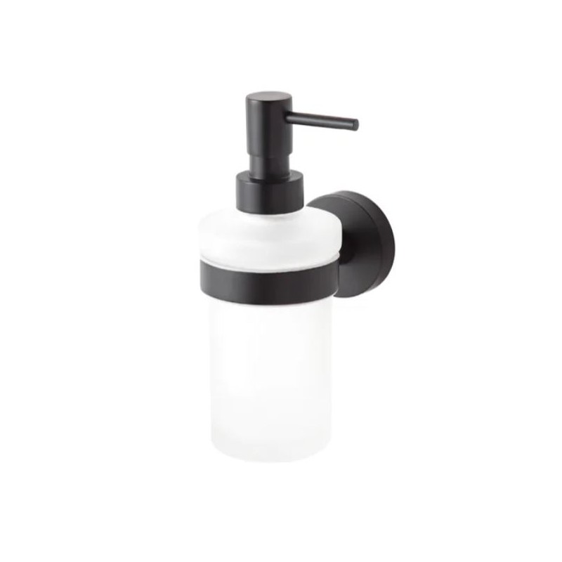 pojemnik na mydło w płynie ze szkła matowego stabilnie osadzony w uchwycie za pomocą uszczelki z elastycznego tworzywa,
