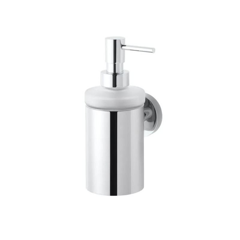 pojemnik na mydło w płynie ze szkła matowego stabilnie osadzony w uchwycie za pomocą uszczelki z elastycznego tworzywa,