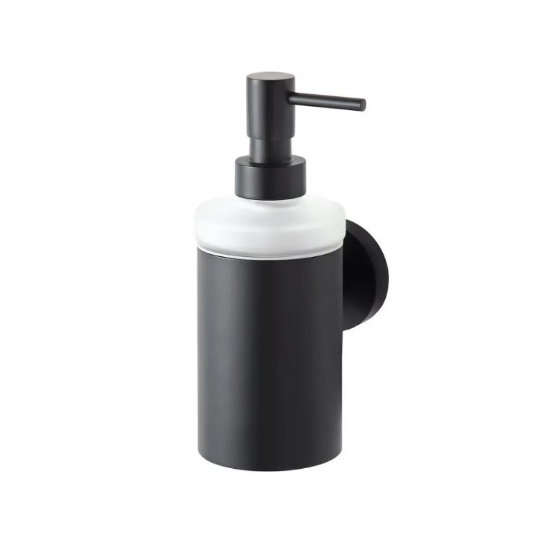 pojemnik na mydło w płynie ze szkła matowego stabilnie osadzony w uchwycie za pomocą uszczelki z elastycznego tworzywa,