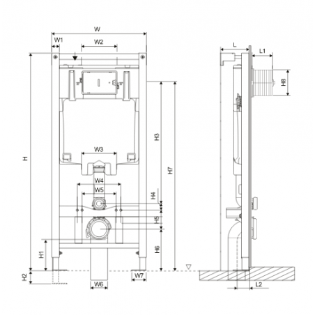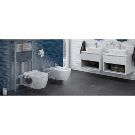 Zabudowany system umożliwia zachowanie estetyki i oszczędność miejsca w każdej łazience. Dzięki zabudowie stelaża płytkami uzyskamy dodatkową przestrzeń do wykorzystania jako półkę na akcesoria łazienkowe, co przyda się z pewnością w niewielkich pomieszczeniach. Konstrukcja ramy i zbiornika pozwalają na regulację głębokości zabudowy w zakresie od 120 do 170 mm, pozwalającą zaoszczędzić sporo cennego miejsca. Podtynkowa zabudowa zbiornika znacząco redukuje poziom hałasu podczas napełniania go wodą.