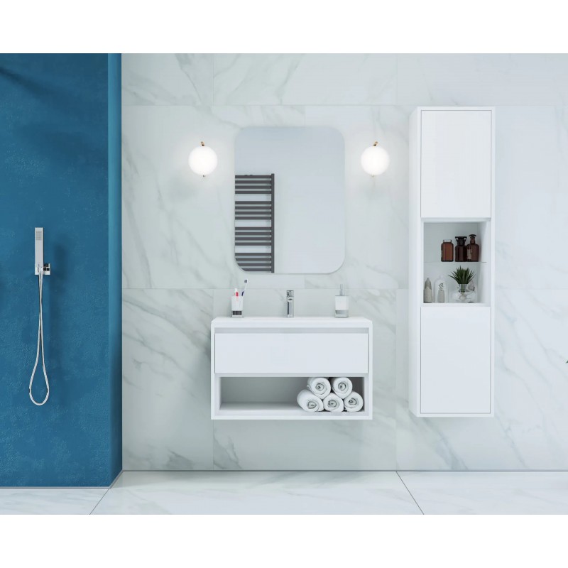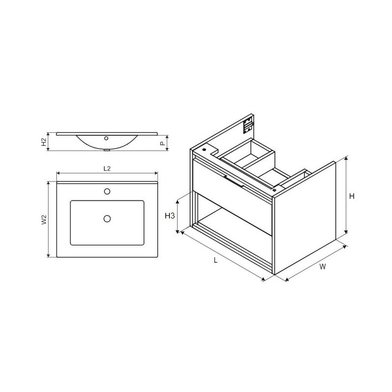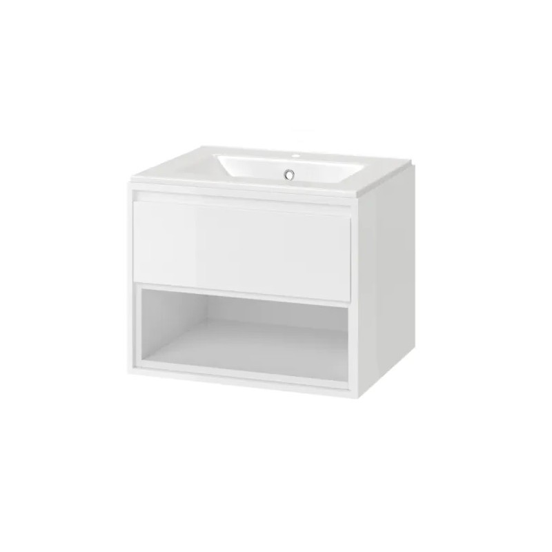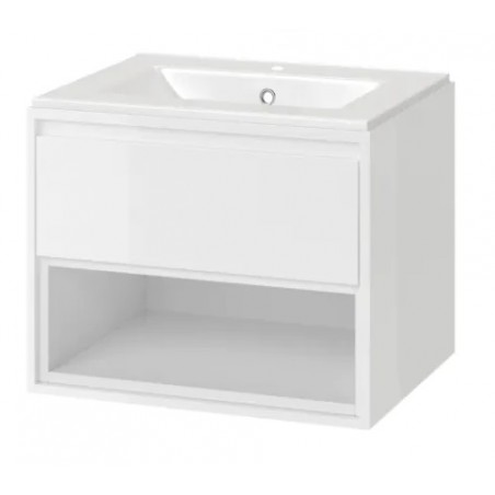 Zestaw uzupełnia ceramiczna umywalka meblowa AS o szerokości 60 cm, dopasowanej do rozmiaru szafki. Umywalka ma przelew i otwór na armaturę. Po bokach znajduje się płaska przestrzeń na odkładanie przedmiotów. Umywalka sprzedawana oddzielnie.