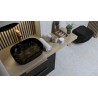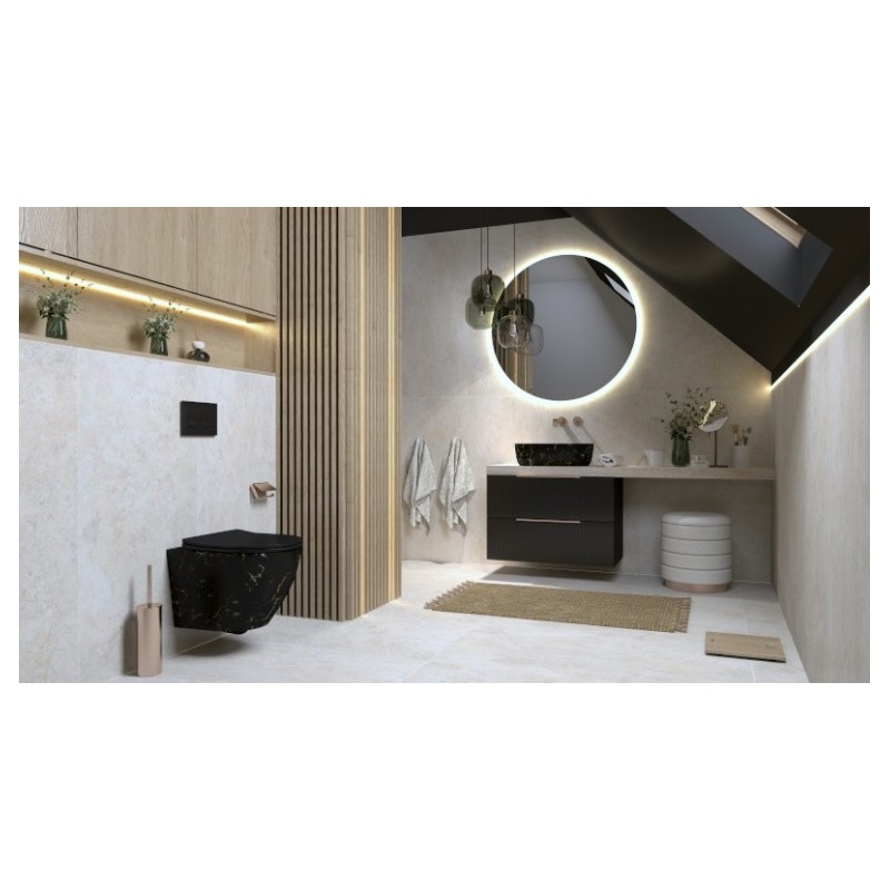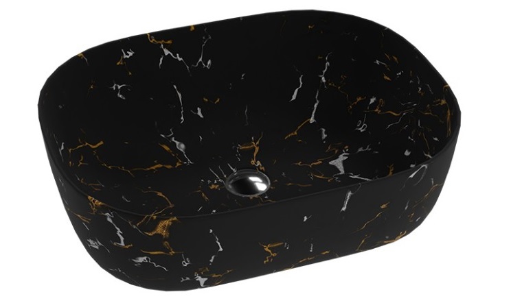 Umywalka nablatowa FUEGO to propozycja dla osób poszukujących nieszablonowego designu. Model ma prostokątny kształt, którego rant jest cienki, a boki lekko zaokrąglone. FUEGO posiada czarny kolor z nieregularnym, złoto-białym motywem, imitującym marmur. Umywalka nablatowa FUEGO daje więc szeroki wachlarz aranżacji- vintage, eklektycznych, loftowych czy nowoczesnych. To stylowa ozdoba, obok której nikt nie przejdzie obojętnie.
