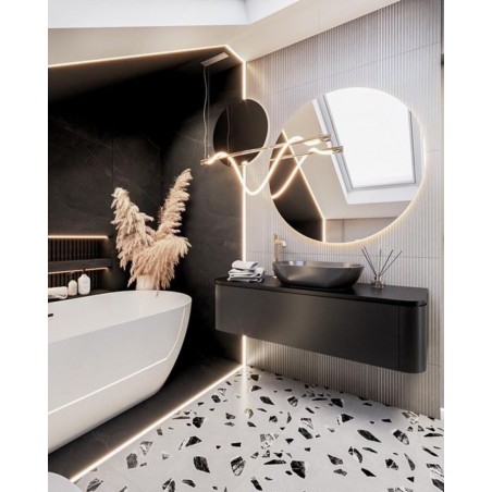 Spritzer to lampa o dynamicznych, płynnych kształtach. Zamknięte w elastycznej tubie światło rozchodzi się delikatnie wzdłuż wyznaczonych linii. Ta elegancka oprawa idealnie współpracuje w grupie opraw tego samego rodzaju tworząc niepowtarzalne konstelacje świetlne. Przeznaczona do zastosowania wewnątrz pomieszczeń (norma IP20). Ze względu na jej unikalny design doskonale odnajdzie się niemal w każdym pomieszczeniu. Poniżej prezentujemy przykładowe aranżacje w salonie, kuchni oraz nowoczesnej łazience.