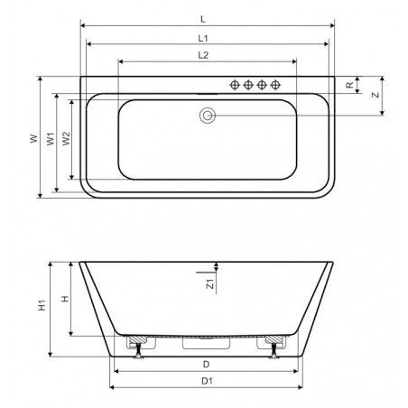 Wanna ze zintegrowaną obudową dodatkowo wzmocniona powierzchnia odkładcza, która umożliwia zamontowanie baterii 4-otworowej nawannowej. Posiada uniwersalny przelew szczelinowy, syfon z korkiem Click-Clack w kolorze chrom oraz stelaż z regulowanymi nóżkami.